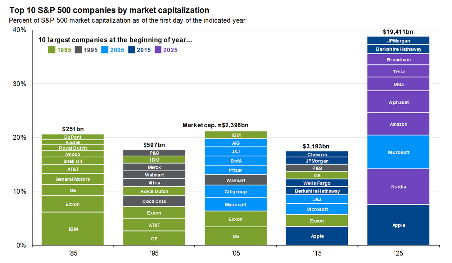 Yet precisely zero of the top companies of 1985 and 1995 are in today’s top 10 today.
